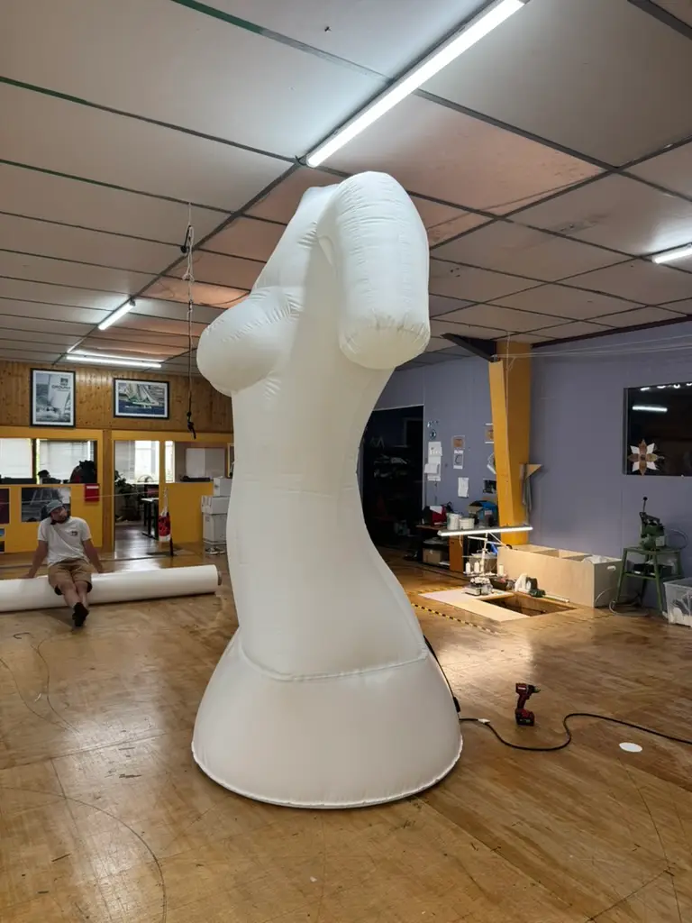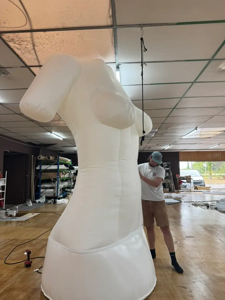 Gesehen zu werden ist der Hauptzweck eines Schildes. Ob als Werbeträger, Hinweis oder einfach nur als hübsche Dekoration, dieser Torso hat sein Ziel erreicht, denn mit einer Höhe von 3,5 m (von seinem Vorsprung aus sogar noch ein wenig höher) hat diese weibliche Büste es geschafft, die Blicke auf sich zu ziehen. Unsere aufblasbare Struktur besteht aus zwei verschiedenen Elementen: dem Rumpf und dem Trikot.