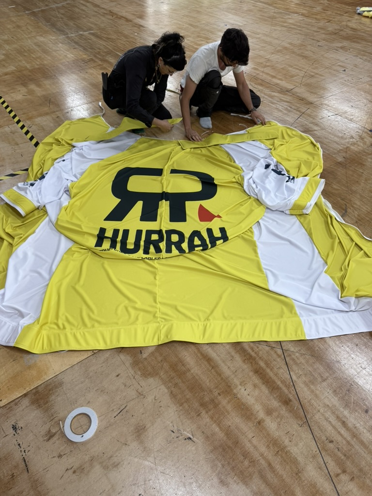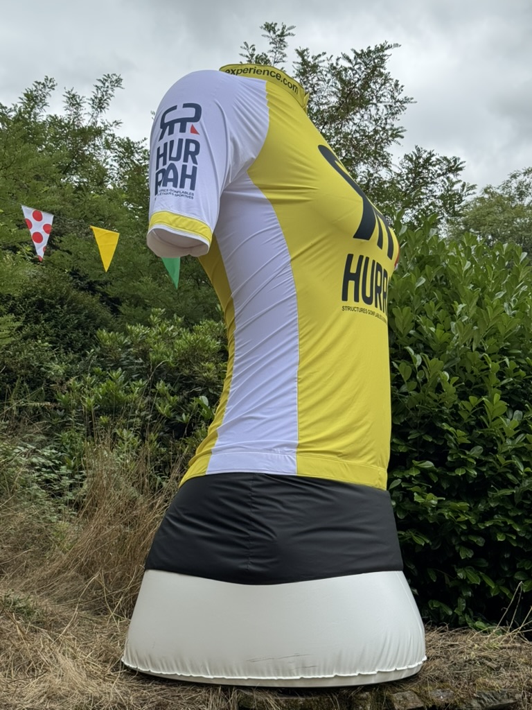 Hurrah propose ce buste gonflable couplé à une réplique XXL d’un maillot entièrement personnalisable. C’est l’assurance de se faire remarquer sans dénaturer le paysage. L’ensemble est réutilisable pour un autre événement : il suffit de changer le maillot. Facile : tout se manipule sans être expert en structures gonflables, et sans risque pour une utilisation publique.