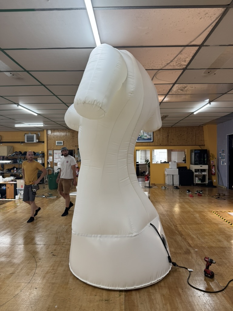 Techniquement, c’est une interprétation surdimensionnée d’un corps féminin. Le tronc, association de pièces en polyester enduit et d’une jupe en PVC, a été conçu, découpé et assemblé dans notre atelier. Dans ce tronc se « cache » la soufflerie et le lest. Pas de ficelles pour tenir l’ensemble : c’est moins esthétique et peu pratique pour une utilisation publique.